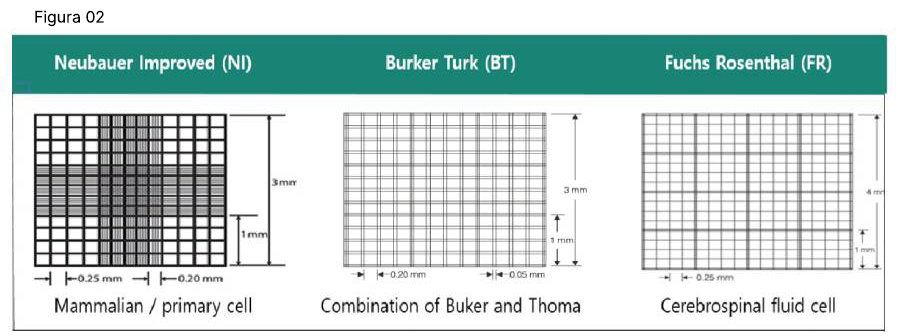 Existem 5 padrões de grelha: Neubauer Improved (células animais/células primárias), Bürker, Bürker Türk (combinação de Bürker e Thoma), Fuchs Rosenthal (células em líquido cefalorraquidiano) e Malassez (células em líquido cefalorraquidiano).