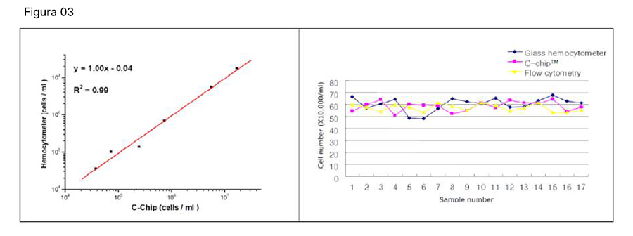 O gráfico à esquerda mostra uma excelente correlação do recuento celular entre o hemocitómetro de vidro e o C Chip. O gráfico à direita mostra que o C Chip apresenta menor erro de contagem do que o hemocitómetro de vidro devido a um desvio padrão mais baixo.
