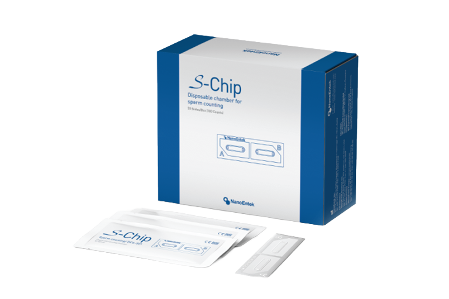 Câmara de contagem descartável para esperma. O S Chip é uma lâmina de plástico descartável e de elevada precisão, com duas câmaras para contagem de espermatozoides.